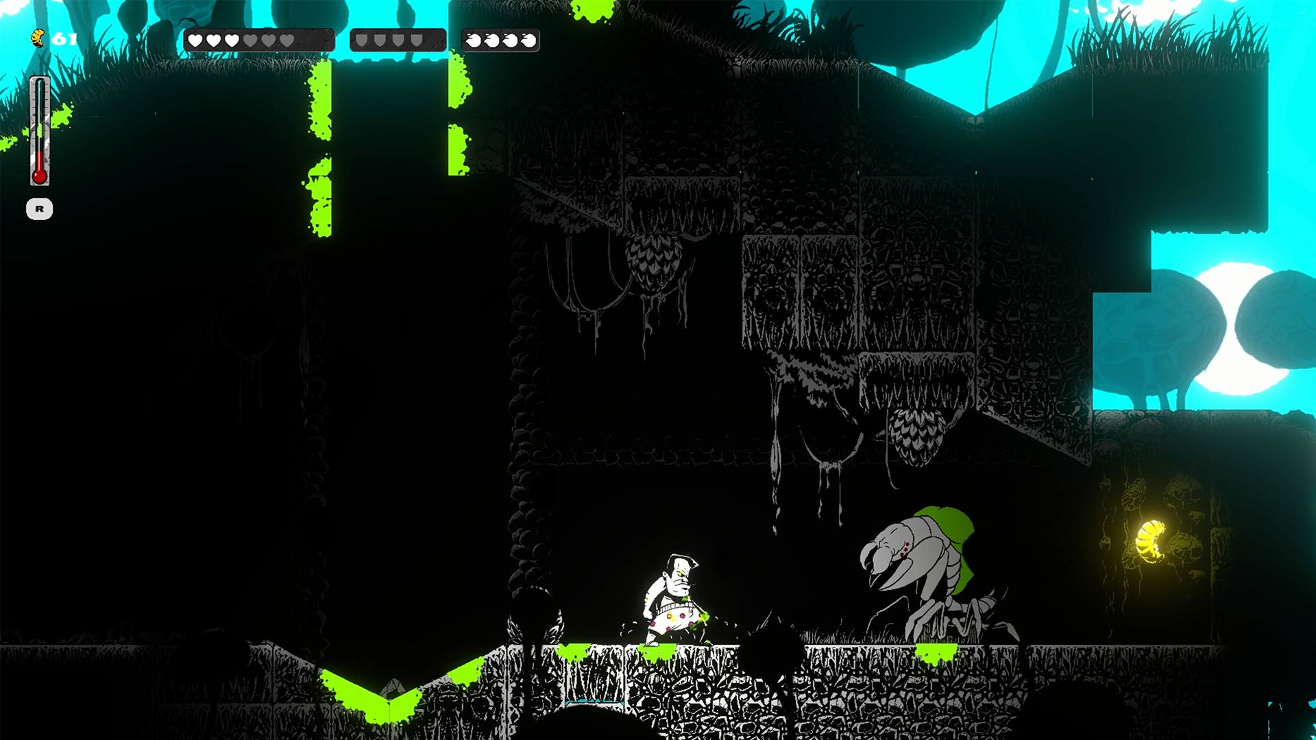 Many grim and dangerous biomes each with unique game mechanics and visual style.