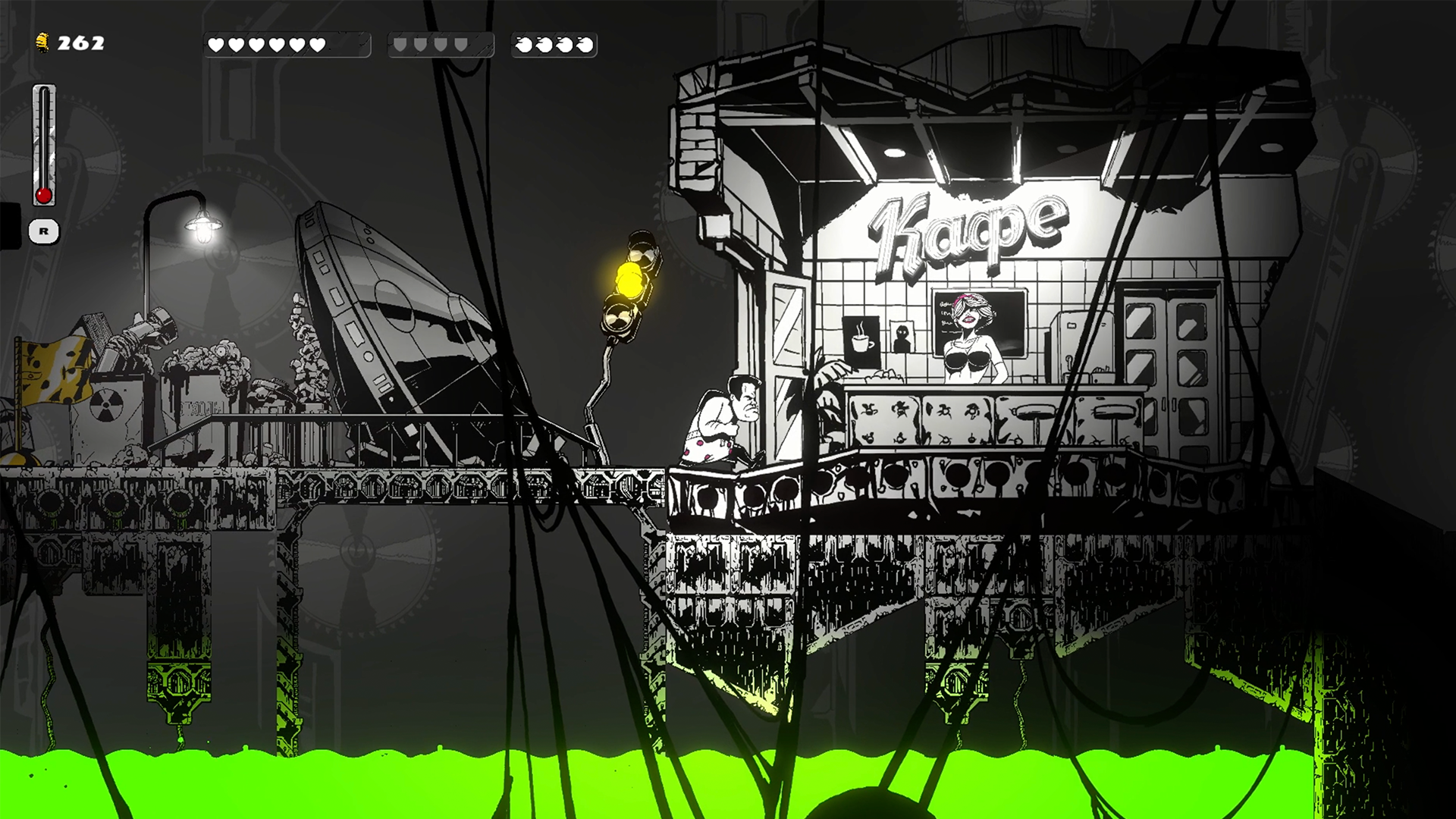 Dive into a world drawn with hand drawn frame-by-frame animation, with a black and white palette and just black humor. Blood, noir and green slurry.